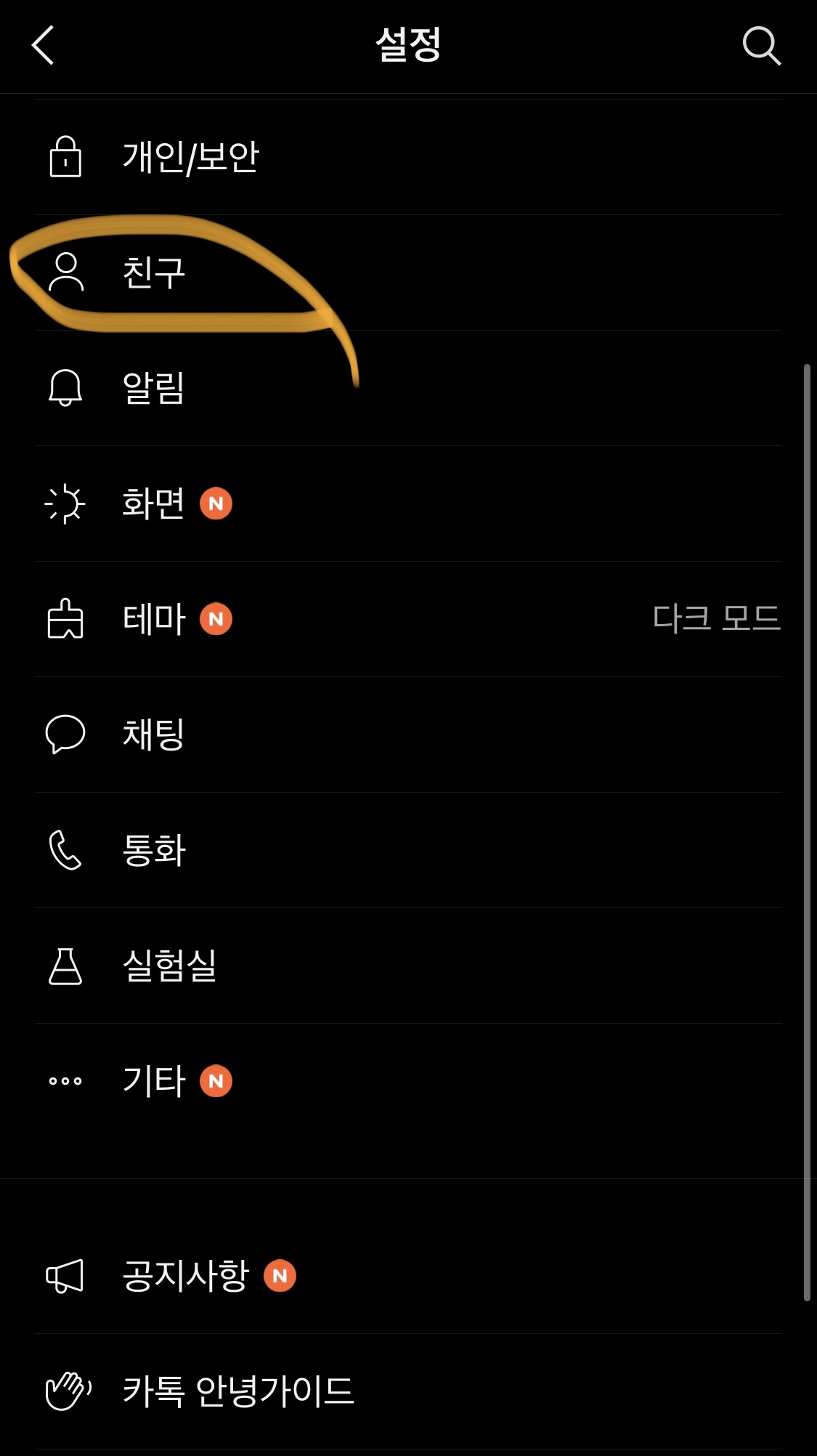 2. ‘설정’에서 ‘친구’를 눌러줍니다.