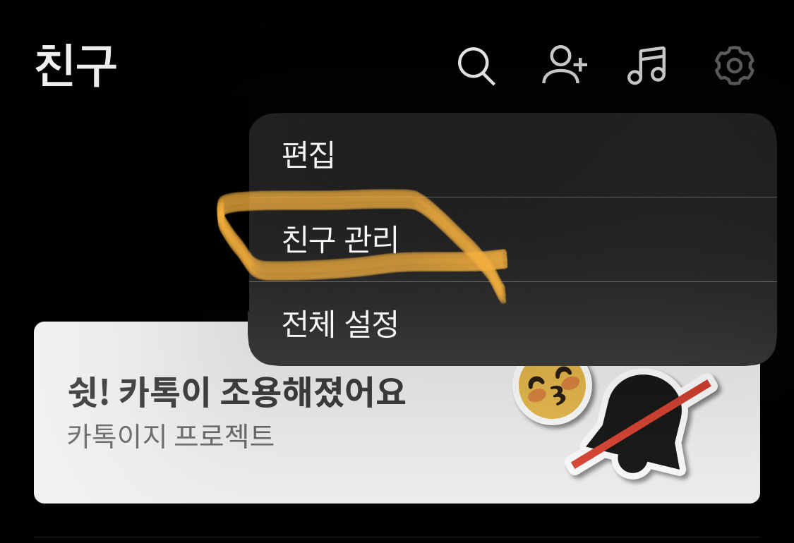 1. 오른쪽 상단 위 톱니바퀴에서 ‘친구 관리’를 눌러줍니다.